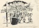 buildings (structures) caricatures inscriptions social issues terminals (buildings) trams (transit vehicles) urban landscapes