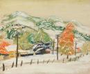 inscribed in pen and blue ink on paper label on reverse u.c.: "SNOW IN AUTUMN / HARRIETVILLE" 20 GNS / LINA BRYANS / DAREBIN BRIDGE HOUSE. / DAREBIN.