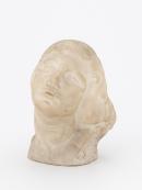 A finely modelled marble head of a young girl. The head is angled backwards with the face upturned. the unfocused eyes and open mouth impart an emotional fragility.