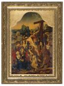 From the thirteenth century onwards the anguished last days of Christ’s life became the dramatic centre of devotional literature, art, and music. These episodes, known collectively as the Passion, culminated in the Crucifixion and demanded new levels of expression on the part of artists. This panel shows how a Passion subject evolved in the hands of the skilled painters of the Southern Netherlands. The holy persons are portrayed in contemporary dress, placing the biblical drama in the present. Originally flanked with wings, the work would have been commissioned as a private altarpiece for a wealthy patron, shown here dressed in fine brocades lowering Christ to the ground.