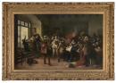 Václav Brozík was a leading official artist of the Austro-Hungarian Empire during the late nineteenth century. La Defénestration portrays the event in Czech history which triggered the Thirty Years War. In the name of a local Protestant majority, Bohemian nobles took action against the Catholic rule of Matthias II, Holy Roman Emperor and head of the Austrian House of Habsburg. Defying orders which forbade them to assemble, the Protestant radicals confronted the Catholic regents in Hradcany Castle on 23 May 1618 and pushed them out a window. The officials reportedly survived by landing on rubbish in the moat.