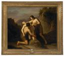 In this tragic Old Testament story, Adam and Eve discover the lifeless body of their second son, Abel, who has been murdered by their firstborn son, Cain. At the left beneath Adam’s leg is the murder weapon, a thorny stick, and a trail of blood. This work is finely painted in the neoclassical manner by Natale Carta, a Sicilian-born artist who rose to prominence in Rome in the mid nineteenth century. Carta was elected to the Academy of St Luke (the artists’ guild) in 1839, then appointed Professor of Painting in 1848 and Professor of Design in 1868, shortly before he created the NGV’s painting. This work is inscribed with red paint at its centre right edge: ‘N. Carta / Prof. dell Accademia / de. S. Luca / Roma 1869’.