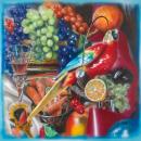 In contrast to other photorealist or superrealist artists of the 1970s, who loved to dazzlingly record the external surface of things, Audrey Flack’s main concern was constructing complex allegorical narratives within her elegantly airbrushed compositions. These reflected her love of seventeenth-century still-life paintings, especially those devoted to the theme of vanitas, the ephemeral duration of all life. Parrots live forever, its very title seemingly an ironic falsehood, is full of imagery that speaks of mortality and decay – ripe fruit, an unfurling ribbon, a half-consumed glass of wine, the cruelly reflecting mirror and the harsh, shiny form of the plastic parrot itself, which will surely endure beyond its owner’s lifetime.