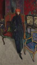 activists berets chairs (furniture forms) Chinoiserie coats (garments) full-length figures poets women (female humans)