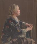 hairstyles hands (animal components) profiles (figures) seated figures silk (textile) single-sitter portraits women (female humans)