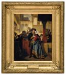 Like a number of other works in this room, by Bedford, Herdman, Van Schendel, Tschaggeny, and Vibert, Le Départ du fiancé was acquired for the NGV by Sir Charles Eastlake, Director of the National Gallery, London, in 1864. When the painting arrived in Melbourne the following year, the Illustrated Australian News described it as: ‘another parting scene. A young girl is standing at the door way and bidding adieu to her lover. The street filled with troops indicates his destination … There is a sombre air pervading the picture, but the sentiment of the two young hearts is effectively rendered’.
