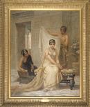 This remarkable frame makes use of design motifs from the painting in the decorative elements of the frame. The ornament on the inner scotia is taken from the frieze on the base of the wall in the background, right. The motif on the leading edge is adapted from the ornament on the lid of the chest. The frame maker is identified by an invoice from John and William Vokins for: An ornamental Persian pattern frame in oil and burnished gold with part of ornament picked out in green gold and double gilt matt flat for picture of Esther put together with bolts and screws. A double gilt tablet with inscription written there on for above frame. The invoice is dated 6 July 1878 and the frame cost £32.14.0. The painting cost £1600.2