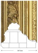 The basic structure of this frame is made up from a number of timber sections, glued together to form an inverted ‘U’ shape, which has subsequently been profiled and the torus section added. The torus sits on a relatively thin base. The overall structure is braced at the centres on the reverse and at the corners. The torus appears to be from plaster and is a high-relief, large-scale pattern of laurel and berry. The corners carry a broad band. The torus section has very few cracks and sits on a broad, flat, leading edge. The smaller runs of ornament are from composition. The frame is gilded throughout. The inner cavetto is burnished on a red bole. The other surfaces are matte, possibly carrying a matte size layer. The torus appears to be oil gilded. The gilding runs through to the working edge.
