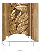 The frame is built from large scale plaster decorative work applied to a wooden chassis. It takes the form of a cushion frame, using large scale imbricated laurel leaves to form a garland surrounding the image.