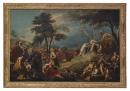 Giambattista Pittoni was, along with Giambattista Tiepolo, one of the leading painters of Venice in the eighteenth century. Pittoni was noted for his French Rococo manner, his method was very different to Tiepolo’s, relying on the painstaking accumulation of motifs and a frequent reworking of details. The Miracle of the Loaves and the Fishes is recorded in all four gospels. Pittoni’s depiction has features unique to the gospel of John (6:3–13): ‘Jesus went into the mountains … a great multitude followed him, He bade them sit down, took five loaves and two fishes and, giving thanks, broke them and the disciples distributed them’.