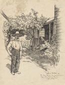 inscribed in pen and ink l.r.: Lionel Lindsay 1901 / "The House with the Iron gate" East Melbourne / (Herman Khür standing.) Where Pe[n]e / Khür & I lived until I went / to Spain in 1902.