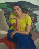 blue (colour) coastlines farmland gaze (psychoanalytical concept) hands (animal components) seated figures women (female humans) yellow (colour)