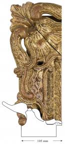The frame is carved from timber after being joined as a complete unit. The timber appears to be laminated to build the depth of the section and has been assembled and joined before carving. The corners are mitred at the front. The frame is gilded on a red bole over a white ground.