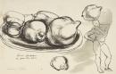 inscribed in pen and ink l.l.: Quinces + green peppers / on green blue plate. / Constance Stokes