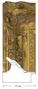The frame is built from composition mouldings on a wooden chassis. The chassis is a profiled softwood section, mitred at the corners. The gilding is matte throughout, on a red bole. A layer of size has been used to tone the gilding.