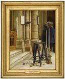 A former pupil of Gustave Moreau, Fernand Sabatté first exhibited In memory of the lowly in Paris in 1899. The painting depicts a coffin being carried away from a side chapel leaving behind only the two trestles on which it has rested, two snuffed- out candles and two small garden flowers which have fallen to the ground. This small group forms the only monument to a life which has passed.