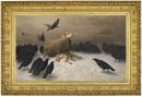 August Schenck spent most of his career in France, specialising in painting landscapes and animal subjects. For over thirty years he was a regular exhibitor at the Paris Salons, where Anguish was first shown in 1878. In Anguish, Schenck has given the ewe clearly recognisable human characteristics, such as determination and sorrow, so that the viewer immediately identifies with its predicament and emotions. The sinister murder of crows also appear organised and patiently await a moment of weakness. Schenck is here metaphorically examining a broader human condition in the context of an animal painting.