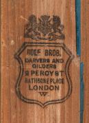 To date the only example in the collection of inlaid wood used as a decorative technique for a frame. The frame uses two different tones of gold to create a running leaf pattern on the flat. The pattern is formed within lines incised into the gesso and is continuous around the corners, centred at the top and bottom. The inlaid wood section, also matched at the corners, uses thick mahogany and rosewood veneers to create the pattern.