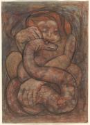 watercolour wash, gouache and coloured wax crayon