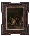 A plaque inlaid on the reverse of the frame identifies the maker. The frame is a reproduction based on seventeenth-century models, using tortoise shell and ebony with stepped corners. Though the frame was presumably built as a representation of a Dutch frame it might also be associated with a German Baroque form.3 Its use on the Steen is demonstrative of early twentieth-century notions of historical reproductions and the belief that a museum frame should be elaborate. The frame was made at the time of acquisition. and is an exceptionally fine example of craftsmanship that would have been expensive to build, making use of costly materials and highly developed workmanship.