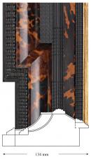 The principal materials of the frame are tortoise shell and ebony on a softwood base. The chassis of the frame is a solid timber section, which is unusual but reflective of the seventeenth-century frames it imitates. The ripple-moulded decorative strips are shaped in ebony and the scotia sections are veneered. The shell is likely to be turtle and in this instance the blond colour and the grain pattern of the timber provide the underlayer of colour and subtle pattern.2