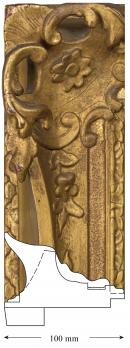 The basic form of the frame is timber. The corners and centres, including the pierced sections, appear to be moulded in composition. The construction is not obvious but the deep cracking across the corners suggests these corners are not of solid timber. The ornaments on the back edge and sight edge are composition. The applied flowers and leaves are also from composition. The surface appears to have been reworked. The gesso layer is thick and fills the detail of the decoration. There is a brushed patina across the surface. The basic timber form is mitred at the corners. The working edge is formed by the addition of timber battens. Triangles of timber re-enforce the corners at the reverse.
