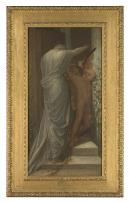 Love and Death was a subject that occupied G. F. Watts for nearly forty years. He painted at least twelve versions of this theme, four of them over two meters in height. There are also eight smaller versions, such as this one. All the paintings show the naked boy-god Eros (Love) straining to deny a grey-cloaked Death entry to the realm of the living. Death’s power has already withered the roses around the doorway, and Love’s efforts prove fruitless.