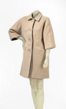 Mid length, cream wool coat. The coat has a three quarter kimono sleeve that is translated across the front and back bodice in a high waisted construction line. High buttoning with no lapels, and a one piece tailored collar.