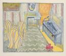 A freely drawn and brightly coloured lithograph of a domestic interior, in which the collaged seat of a chair lifts up to reveal a symbol of domesticity - an Electrolux vacuum cleaner