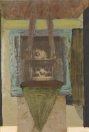 collage of lithograph printed in brown ink, oil, synthetic polymer paint and sand on paper