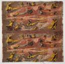 Cream ground with pinks/browns/yellow/black desert landscape with tree forms and figures.