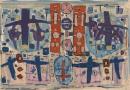 label, printed and inscribed in ink on cotton on reverse l.r.: this tapestry nº 78/2 / 'Images' / woven by / Victorian Tapestry Workshop / date: 1978 / size 2.35 m x 3.08 m / warp: cotton / weft: wool / artist: Roger Kemp / weavers (...illeg.)