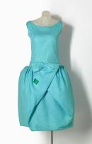 Turquoise, long bodice, sleeveless, high wide neckline, low at back, bouffant skirt, lined/padded with lawn.