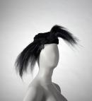 Black, bands of tubing on net crown, 2 sweeping feather ornaments slightly placed off-centre.