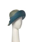 Turquoise and pale green paribuntal straw trimmed with a turquoise band around crown and turquoise button at centre back.