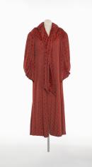 Straight front with panel at back, deep cut sleeves. Burnt orange self figured velvet, deep collar with scarves ends; to drape around the neck. Long sleeves slurred at head and mid-arm tapering at the wrist. Lined in red satin.