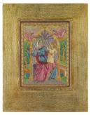 The frame, with the Rowley label from the 1920’s, is finished with silver leaf and given a washed/glazed layer to shift the colour toward gold. The surface is stippled gesso.