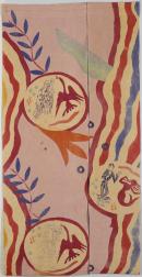 Natural linen with grand vignettes juxtaposed amongst pink, orange, yellow, peach and blue wavy lines. Printed with human and animal figures, birds and a mermaid set inside vignettes, in purple, pink, green and orange. The edges are turned over and finished with blue bias-binding. The top is turned over and is finished with curtain tape machine stitched to the back.