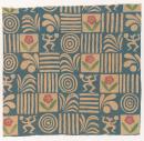 Textile length printed with repeat square design of line, figure and foliage motifs, in blue, pink and green on cream linen.