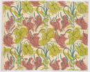 Three colour screenprinted textile. Cream ground with large chartreuse and pink/brown blotches with overprint of green line work depicting emperor lilies and leaves in a repeating pattern.