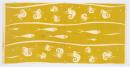 Cotton furnishing fabric, mustard screenprint repeat pattern of seahorses, fish, wavy line.