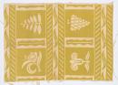 Beige ground, one colour screenprint consisting of lime green print with negative stylised flower and fruit motifs in blocks interspersed with lines of diagonal stripes and leaf motifs.
