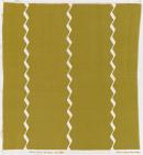 Cotton furnishing fabric, cream ground, green/mustard negative screenprint, continuous zig zag lines.