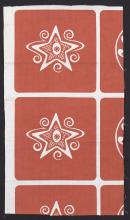 One colour discharge print. Design of large terracotta squares with negative central star and flower motifs.