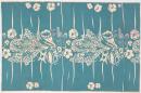 Single colour screenprint. Cream ground with green blue print with large negative motifs seaweed, shells, starfish and wavy stripes arranged centrally in a vertical stripe.