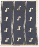 Cream ground, one colour print consisting of slate blue print with negative 'S' shapes interspersed with triangular shaped lines forming a horizontal stripe.