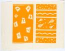 Two tea towel designs. Orange screenprint with negative pattern of emus and various animals within border.