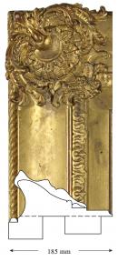 The frame is made from a simple straight-sided ogee profile, elaborated at the corners and centres with large foliate composition decorations. The basic structure is mitred at the corners and braced on the reverse. The back edge carries a continuous run of composition rope, making a direct reference to the nautical theme of the painting. In a similar way the large ornaments to the corners and centres carry a sense of regalia. The surface is gilded and the bead has been burnished. The gilding, on a red bole, is otherwise matte and presents a solid surface, perhaps indicative of double gilding. A loss in the composition reveals a base layer of netting under the gesso layer. The wide flat at the sight edge carries, in black ink, the names of the locations and sea vessels in the painting.
