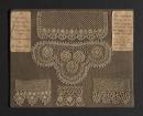 Crochet lace sample rectangular shape with an open lattice, floral and scalloped border.