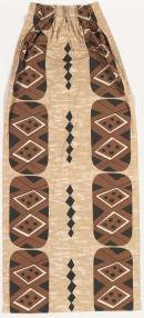 Curtains, both with screenprinted design of shields on cream ground in black, brown and beige. Five pinch-pleats evenly spaced at the top edge and a weight in each of the two bottom edge corners.